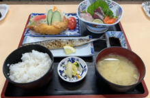 「刺身定食」の刺身は6種類程度付いて、焼き魚付き。「焼き魚定食」にもさらに焼き魚が付きます。オススメは「おまかせ定食」。刺身の盛り合わせに焼き魚、エビフライにご飯と味噌汁、漬物がセットになった満腹定食。おかずが豊富なのでご飯が進みますが、何とご飯のおかわりは無料です。