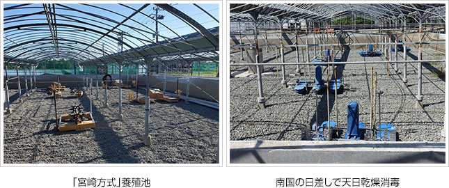 本県のウナギ養殖池は「宮崎方式」と呼ばれ、池底に砂利を被せ、養殖池自体にバクテリアによる生物ろ過機能を持たせて循環式養殖を可能とし、ウナギの出荷後は、完全に排水洗浄し、南国宮崎の天日干しによる消毒を行います。このため、その安定した水質と疾病予防効果により、高い生産性と高品質なウナギの生産を可能としていることが大きな特徴です。